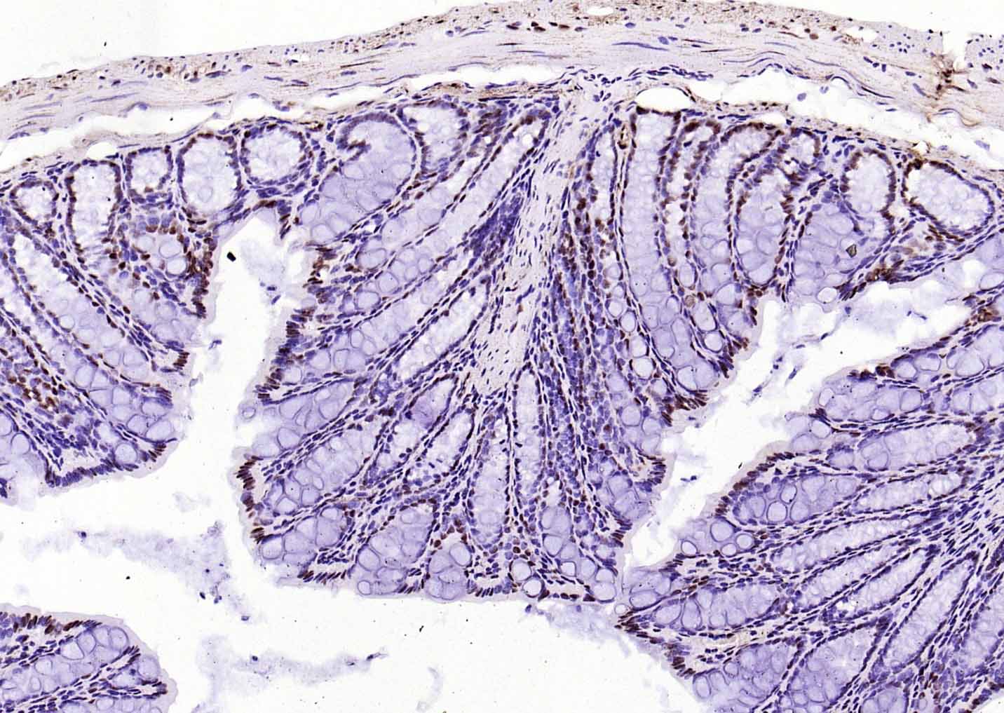 Paraformaldehyde-fixed, paraffin embedded (mouse colon); Antigen retrieval by boiling in sodium citrate buffer (pH6.0) for 15min; Block endogenous peroxidase by 3% hydrogen peroxide for 20 minutes; Blocking buffer (normal goat serum) at 37°C for 30min; Antibody incubation with (Histone H3 (Tri Methyl K4)) Polyclonal Antibody, Unconjugated (bs-4715R) at 1:200 overnight at 4°C, followed by operating according to SP Kit(Rabbit) (sp-0023) instructionsand DAB staining.