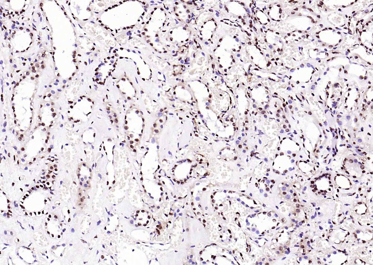 Paraformaldehyde-fixed, paraffin embedded (rat kidney); Antigen retrieval by boiling in sodium citrate buffer (pH6.0) for 15min; Block endogenous peroxidase by 3% hydrogen peroxide for 20 minutes; Blocking buffer (normal goat serum) at 37°C for 30min; Antibody incubation with (Histone H3 (Tri Methyl K4)) Polyclonal Antibody, Unconjugated (bs-4715R) at 1:200 overnight at 4°C, followed by operating according to SP Kit(Rabbit) (sp-0023) instructionsand DAB staining.