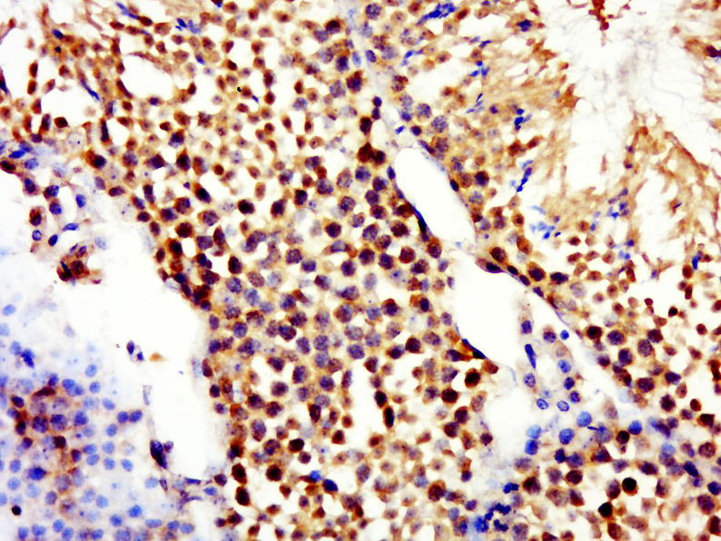 Paraformaldehyde-fixed, paraffin embedded (mouse testis); Antigen retrieval by boiling in sodium citrate buffer (pH6.0) for 15min; Block endogenous peroxidase by 3% hydrogen peroxide for 20 minutes; Blocking buffer (normal goat serum) at 37°C for 30min; Antibody incubation with (RNF16) Polyclonal Antibody, Unconjugated (bs-9162R) at 1:400 overnight at 4°C, followed by a conjugated secondary (sp-0023) for 20 minutes and DAB staining.
