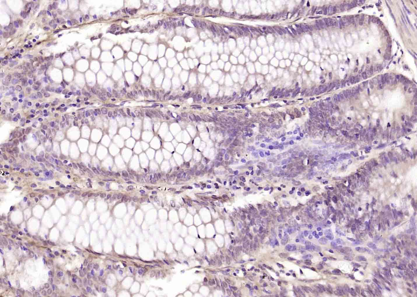 Paraformaldehyde-fixed, paraffin embedded (human colon carcinoma); Antigen retrieval by boiling in sodium citrate buffer (pH6.0) for 15min; Block endogenous peroxidase by 3% hydrogen peroxide for 20 minutes; Blocking buffer (normal goat serum) at 37°C for 30min; Antibody incubation with (MLF1) Polyclonal Antibody, Unconjugated (bs-9179R) at 1:200 overnight at 4°C, followed by operating according to SP Kit(Rabbit) (sp-0023) instructionsand DAB staining.