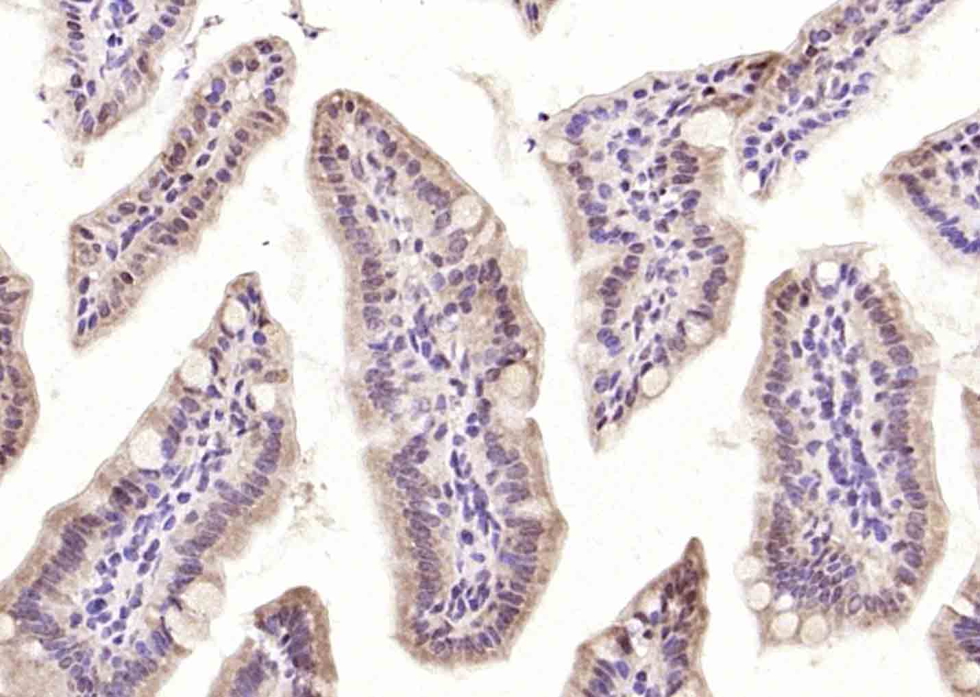 Paraformaldehyde-fixed, paraffin embedded (mouse intestine); Antigen retrieval by boiling in sodium citrate buffer (pH6.0) for 15min; Block endogenous peroxidase by 3% hydrogen peroxide for 20 minutes; Blocking buffer (normal goat serum) at 37°C for 30min; Antibody incubation with (MLF1) Polyclonal Antibody, Unconjugated (bs-9179R) at 1:200 overnight at 4°C, followed by operating according to SP Kit(Rabbit) (sp-0023) instructionsand DAB staining.