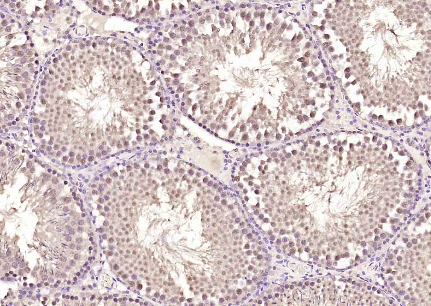 Paraformaldehyde-fixed, paraffin embedded (rat testis); Antigen retrieval by boiling in sodium citrate buffer (pH6.0) for 15min; Block endogenous peroxidase by 3% hydrogen peroxide for 20 minutes; Blocking buffer (normal goat serum) at 37°C for 30min; Antibody incubation with (ZNF354C) Polyclonal Antibody, Unconjugated (bs-9189R) at 1:200 overnight at 4°C, followed by operating according to SP Kit(Rabbit) (sp-0023) instructionsand DAB staining.