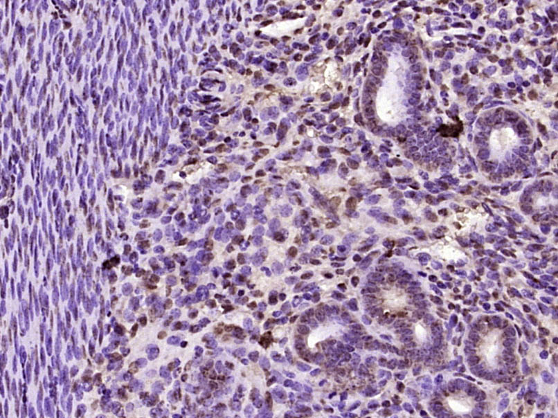 Paraformaldehyde-fixed, paraffin embedded (Mouse uterus); Antigen retrieval by boiling in sodium citrate buffer (pH6.0) for 15min; Block endogenous peroxidase by 3% hydrogen peroxide for 20 minutes; Blocking buffer (normal goat serum) at 37°C for 30min; Antibody incubation with (RNF113A) Polyclonal Antibody, Unconjugated (bs-9248R) at 1:400 overnight at 4°C, followed by operating according to SP Kit(Rabbit) (sp-0023) instructionsand DAB staining.