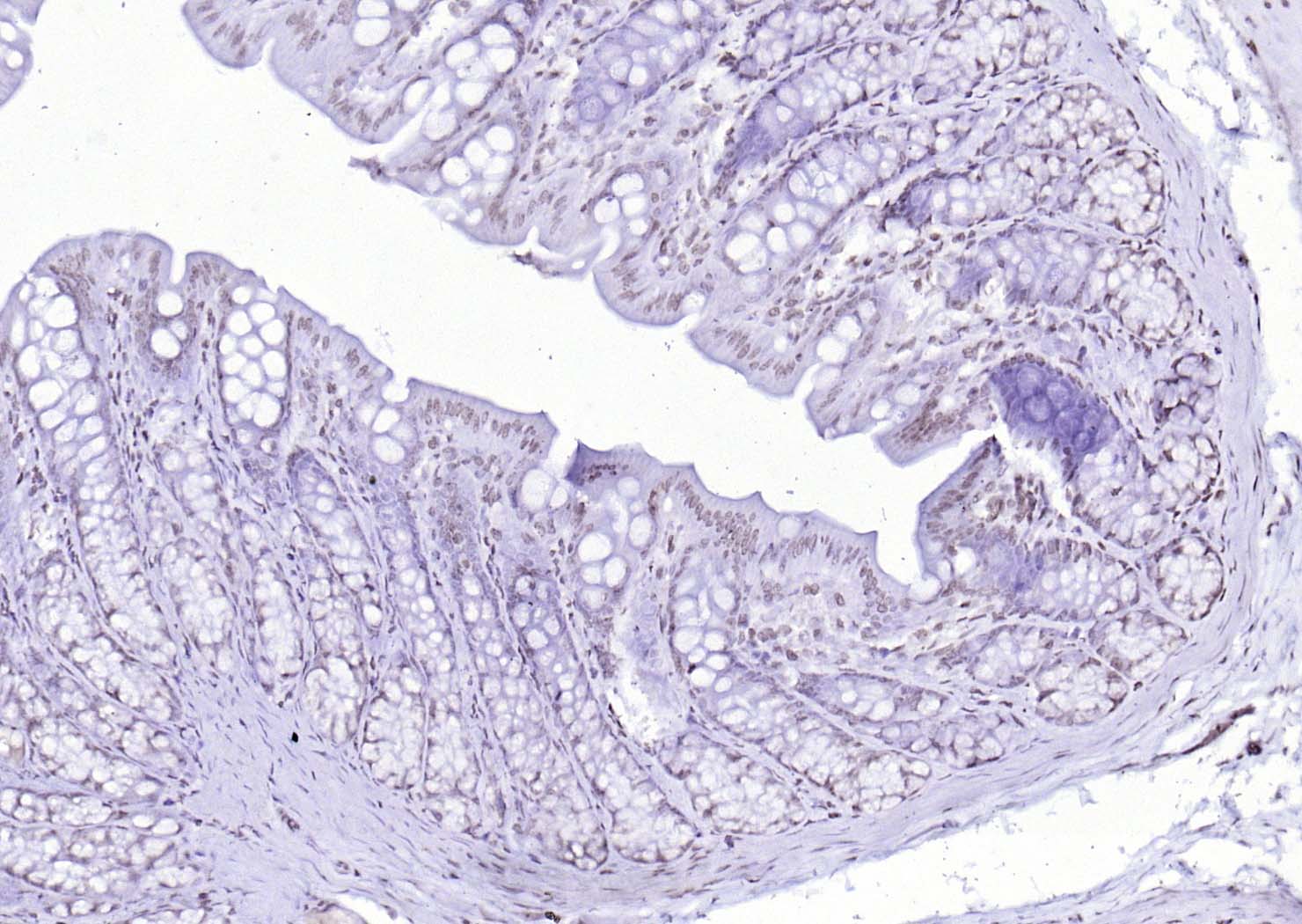 Paraformaldehyde-fixed, paraffin embedded (rat colon); Antigen retrieval by boiling in sodium citrate buffer (pH6.0) for 15min; Block endogenous peroxidase by 3% hydrogen peroxide for 20 minutes; Blocking buffer (normal goat serum) at 37°C for 30min; Antibody incubation with (RNF113A) Polyclonal Antibody, Unconjugated (bs-9248R) at 1:200 overnight at 4°C, followed by operating according to SP Kit(Rabbit) (sp-0023) instructionsand DAB staining.