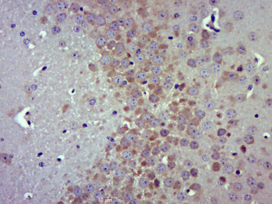 Paraformaldehyde-fixed, paraffin embedded (Mouse brain); Antigen retrieval by boiling in sodium citrate buffer (pH6.0) for 15min; Block endogenous peroxidase by 3% hydrogen peroxide for 20 minutes; Blocking buffer (normal goat serum) at 37°C for 30min; Antibody incubation with (PRMT5) Polyclonal Antibody, Unconjugated (bs-6992R) at 1:500 overnight at 4°C, followed by a conjugated secondary (sp-0023) for 20 minutes and DAB staining.