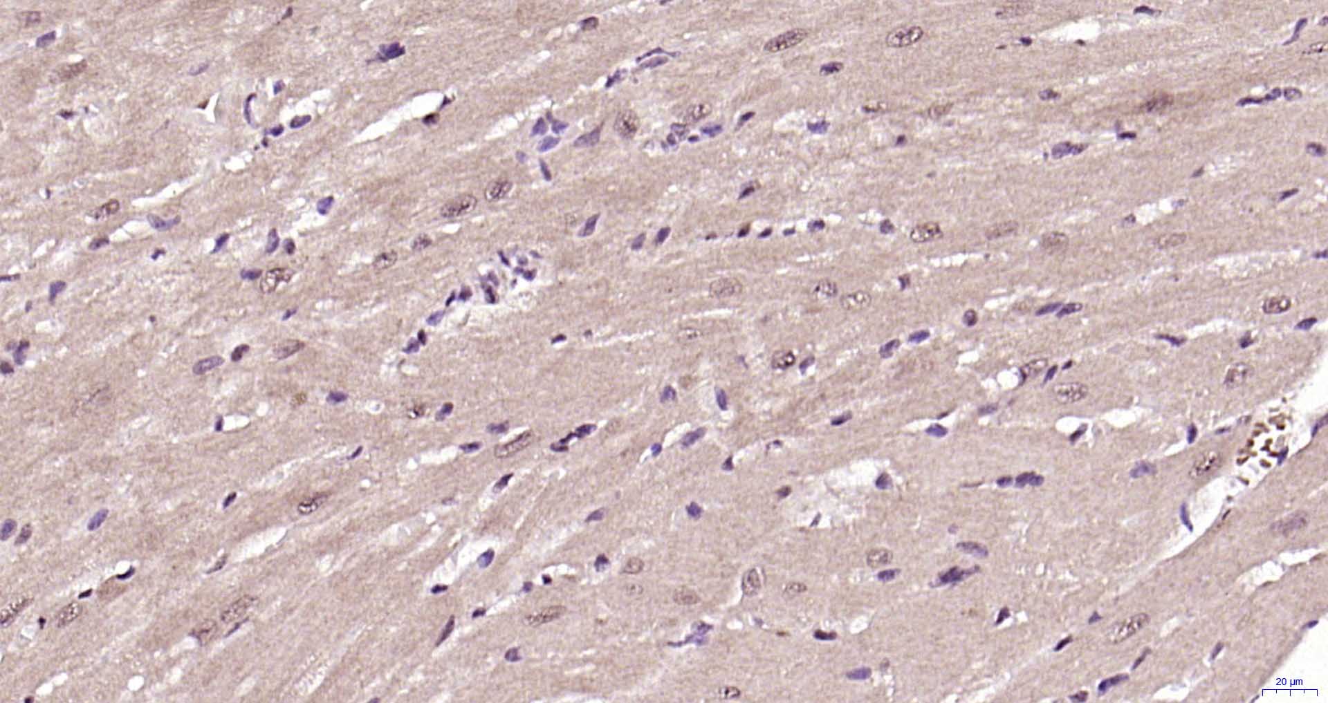 Paraformaldehyde-fixed, paraffin embedded Rat Heart; Antigen retrieval by boiling in sodium citrate buffer (pH6.0) for 15 min; Antibody incubation with CSEN Polyclonal Antibody, Unconjugated (bs-9853R) at 1:200 overnight at 4°C, followed by conjugation to the SP Kit (Rabbit, SP-0023) and DAB (C-0010) staining.