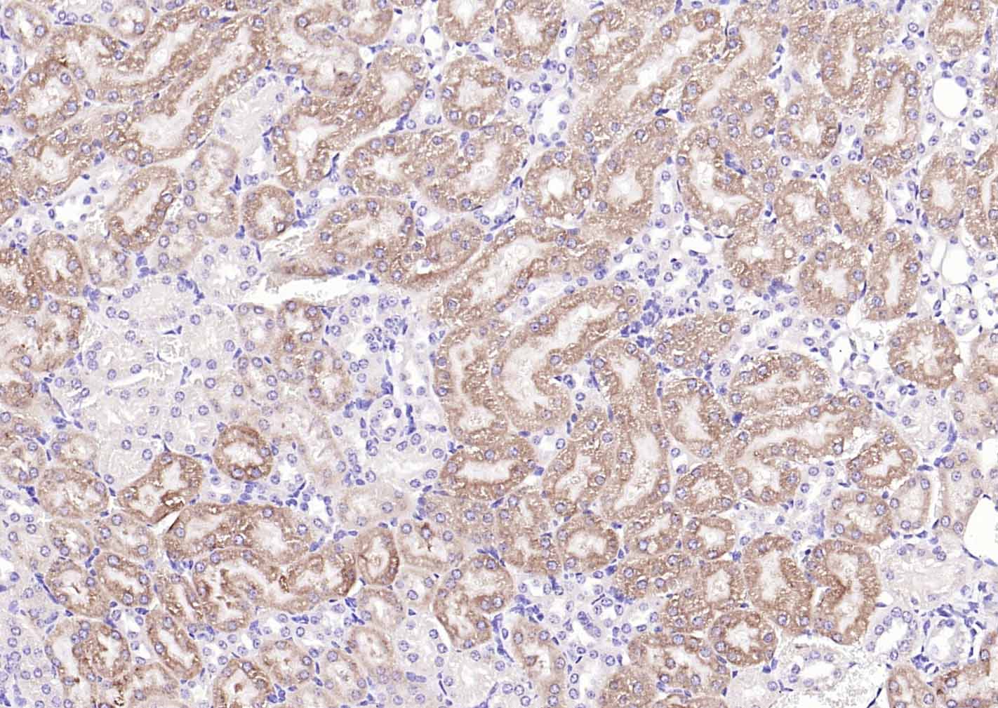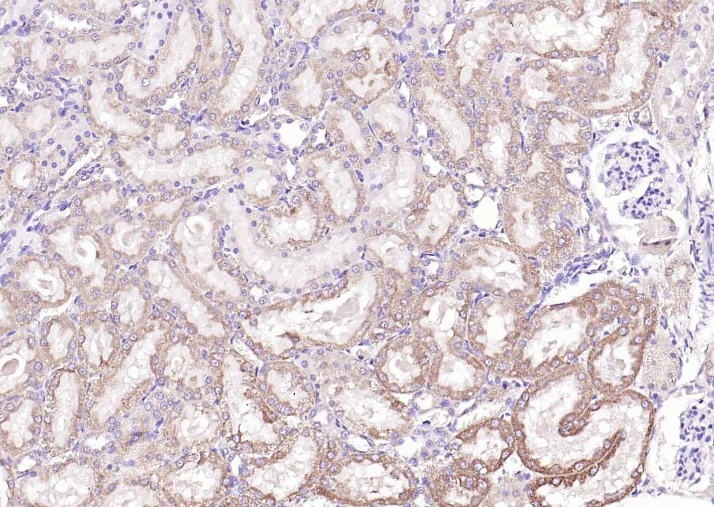 Paraformaldehyde-fixed, paraffin embedded (mouse kidney); Antigen retrieval by boiling in sodium citrate buffer (pH6.0) for 15min; Block endogenous peroxidase by 3% hydrogen peroxide for 20 minutes; Blocking buffer (normal goat serum) at 37°C for 30min; Incubation with (GPLD1) Polyclonal Antibody, Unconjugated (bs-9910R) at 1:200 overnight at 4°C, followed by operating according to SP Kit(Rabbit) (sp-0023) instructionsand DAB staining.