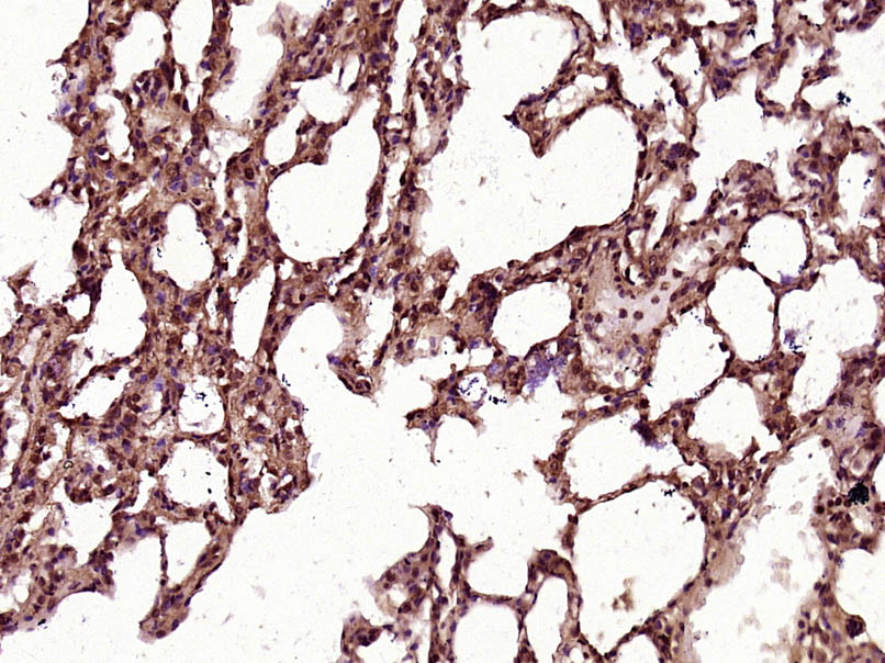 Paraformaldehyde-fixed, paraffin embedded (Rat lung); Antigen retrieval by boiling in sodium citrate buffer (pH6.0) for 15min; Block endogenous peroxidase by 3% hydrogen peroxide for 20 minutes; Blocking buffer (normal goat serum) at 37°C for 30min; Antibody incubation with (MESP1) Polyclonal Antibody, Unconjugated (bs-9471R) at 1:400 overnight at 4°C, followed by operating according to SP Kit(Rabbit) (sp-0023) instructionsand DAB staining.