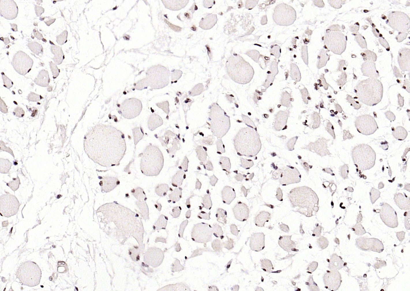 Paraformaldehyde-fixed, paraffin embedded (human skeletal muscle); Antigen retrieval by boiling in sodium citrate buffer (pH6.0) for 15min; Block endogenous peroxidase by 3% hydrogen peroxide for 20 minutes; Blocking buffer (normal goat serum) at 37°C for 30min; Incubation with (Phospho-SRF (Ser77) ) Polyclonal Antibody, Unconjugated (bs-9602R) at 1:200 overnight at 4°C, followed by operating according to SP Kit(Rabbit) (sp-0023) instructionsand DAB staining.