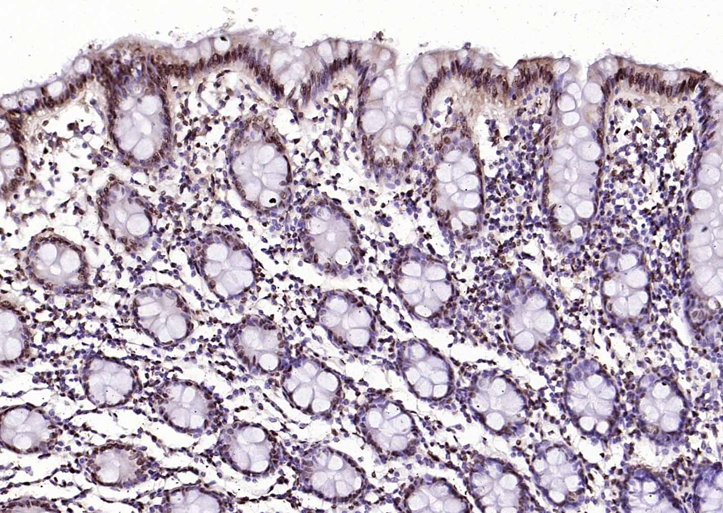 Paraformaldehyde-fixed, paraffin embedded (human colon); Antigen retrieval by boiling in sodium citrate buffer (pH6.0) for 15min; Block endogenous peroxidase by 3% hydrogen peroxide for 20 minutes; Blocking buffer (normal goat serum) at 37°C for 30min; Incubation with (Phospho-SRF (Ser77) ) Polyclonal Antibody, Unconjugated (bs-9602R) at 1:200 overnight at 4°C, followed by operating according to SP Kit(Rabbit) (sp-0023) instructionsand DAB staining.
