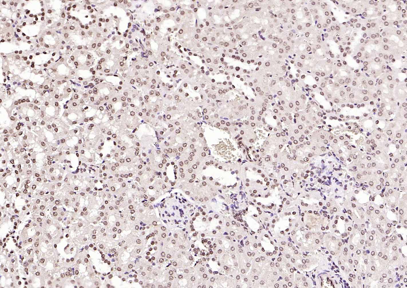 Paraformaldehyde-fixed, paraffin embedded (mouse kidney); Antigen retrieval by boiling in sodium citrate buffer (pH6.0) for 15min; Block endogenous peroxidase by 3% hydrogen peroxide for 20 minutes; Blocking buffer (normal goat serum) at 37°C for 30min; Incubation with (Phospho-SRF (Ser77) ) Polyclonal Antibody, Unconjugated (bs-9602R) at 1:200 overnight at 4°C, followed by operating according to SP Kit(Rabbit) (sp-0023) instructionsand DAB staining.