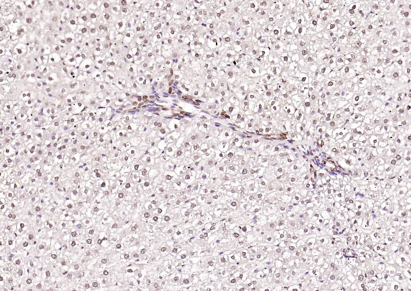 Paraformaldehyde-fixed, paraffin embedded (mouse liver); Antigen retrieval by boiling in sodium citrate buffer (pH6.0) for 15min; Block endogenous peroxidase by 3% hydrogen peroxide for 20 minutes; Blocking buffer (normal goat serum) at 37°C for 30min; Incubation with (Phospho-SRF (Ser77) ) Polyclonal Antibody, Unconjugated (bs-9602R) at 1:200 overnight at 4°C, followed by operating according to SP Kit(Rabbit) (sp-0023) instructionsand DAB staining.