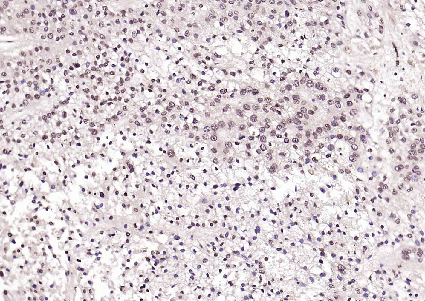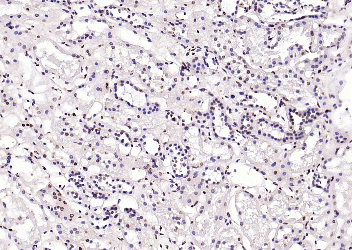 Paraformaldehyde-fixed, paraffin embedded (human kidney); Antigen retrieval by boiling in sodium citrate buffer (pH6.0) for 15min; Block endogenous peroxidase by 3% hydrogen peroxide for 20 minutes; Blocking buffer (normal goat serum) at 37°C for 30min; Incubation with (Phospho-SRF (Ser77) ) Polyclonal Antibody, Unconjugated (bs-9602R) at 1:200 overnight at 4°C, followed by operating according to SP Kit(Rabbit) (sp-0023) instructionsand DAB staining.