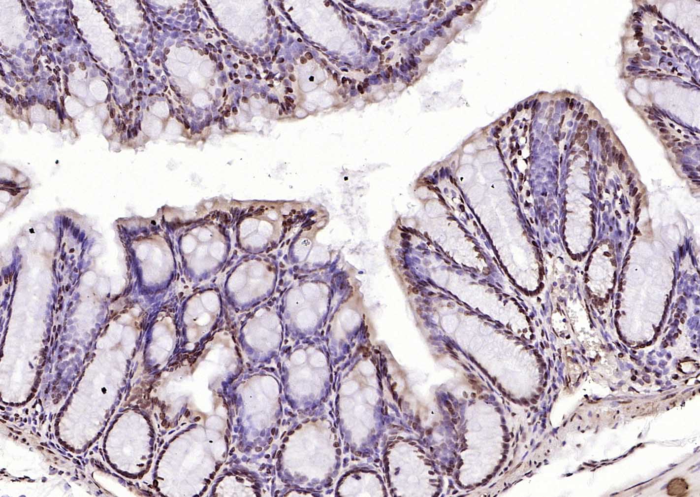 Paraformaldehyde-fixed, paraffin embedded (mouse colon); Antigen retrieval by boiling in sodium citrate buffer (pH6.0) for 15min; Block endogenous peroxidase by 3% hydrogen peroxide for 20 minutes; Blocking buffer (normal goat serum) at 37°C for 30min; Incubation with (Phospho-SRF (Ser77) ) Polyclonal Antibody, Unconjugated (bs-9602R) at 1:200 overnight at 4°C, followed by operating according to SP Kit(Rabbit) (sp-0023) instructionsand DAB staining.