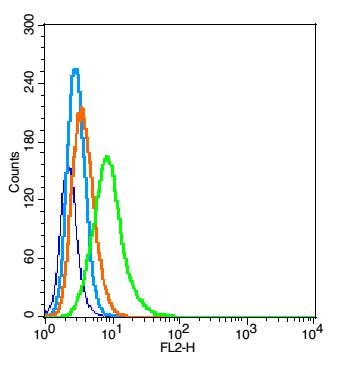 Blank control(blue): RSC96 (fixed with 2% paraformaldehyde (10 min)). Primary Antibody:Rabbit Anti- PCDH20 antibody(bs-11113R), Dilution: 1μg in 100 μL 1X PBS containing 0.5% BSA; Isotype Control Antibody: Rabbit IgG(orange) ,used under the same conditions ); Secondary Antibody: Goat anti-rabbit IgG-PE(white blue), Dilution: 1:200 in 1 X PBS containing 0.5% BSA.