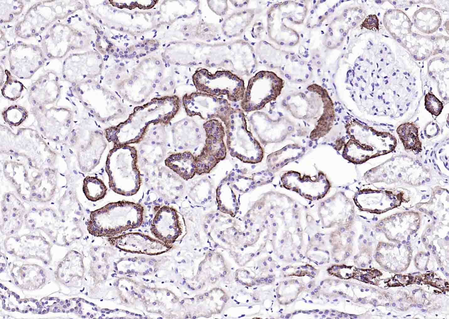 Paraformaldehyde-fixed, paraffin embedded Human Kidney; Antigen retrieval by boiling in sodium citrate buffer (pH6.0) for 15 min; Antibody incubation with ATP1A1 Polyclonal Antibody, Unconjugated (bs-9570R) at 1:200 overnight at 4°C, followed by conjugation to the bs-0295G-HRP and DAB (C-0010) staining.