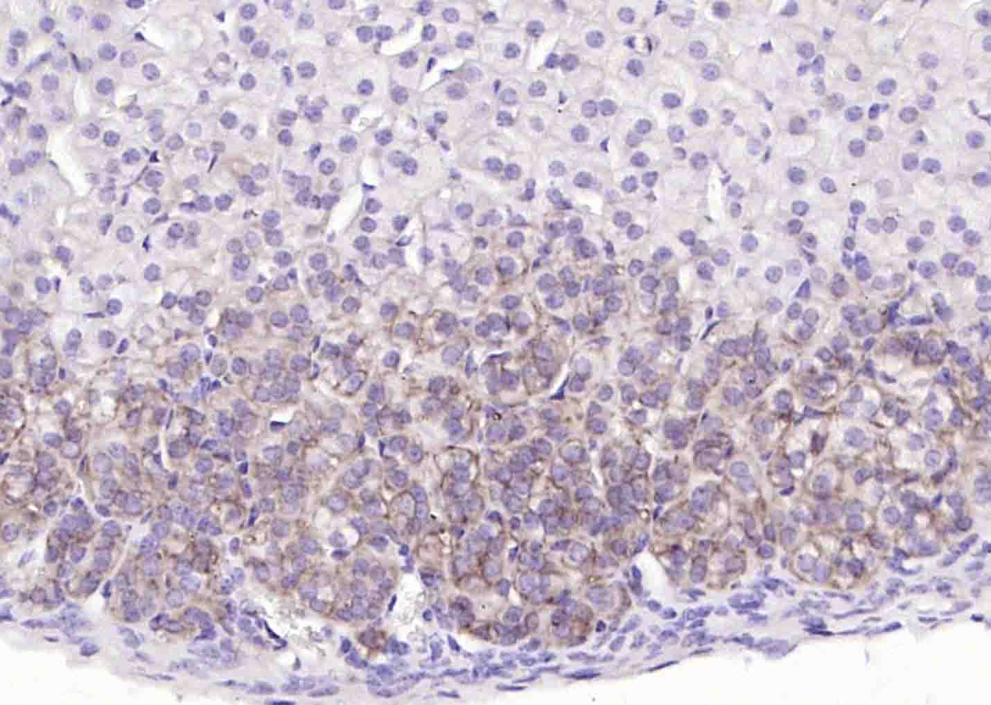 Paraformaldehyde-fixed, paraffin embedded Mouse Adrenal Gland; Antigen retrieval by boiling in sodium citrate buffer (pH6.0) for 15 min; Antibody incubation with ATP1A1 Polyclonal Antibody, Unconjugated (bs-9570R) at 1:200 overnight at 4°C, followed by conjugation to the bs-0295G-HRP and DAB (C-0010) staining.