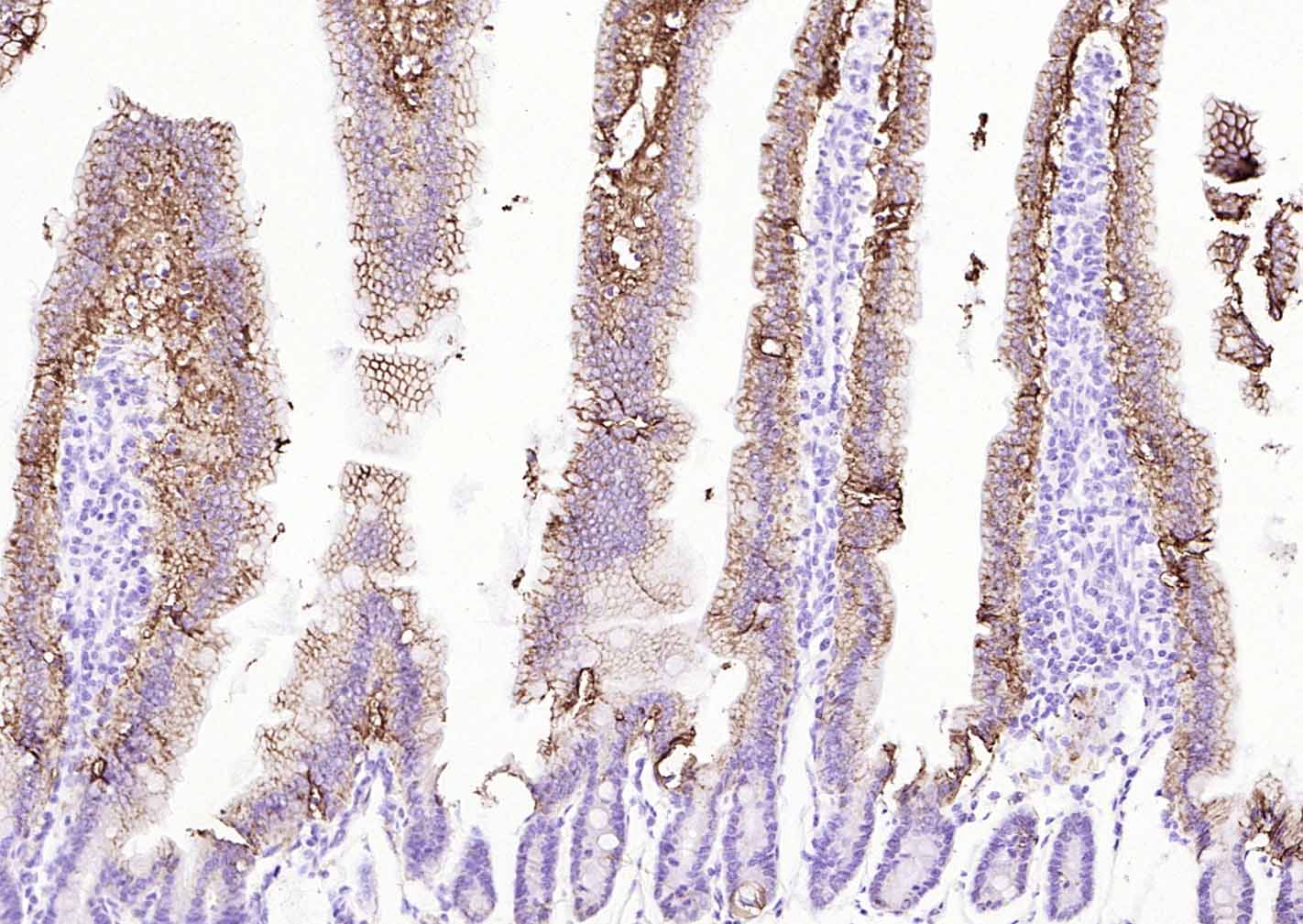 Paraformaldehyde-fixed, paraffin embedded Mouse Small Intestine; Antigen retrieval by boiling in sodium citrate buffer (pH6.0) for 15 min; Antibody incubation with ATP1A1 Polyclonal Antibody, Unconjugated (bs-9570R) at 1:200 overnight at 4°C, followed by conjugation to the bs-0295G-HRP and DAB (C-0010) staining.