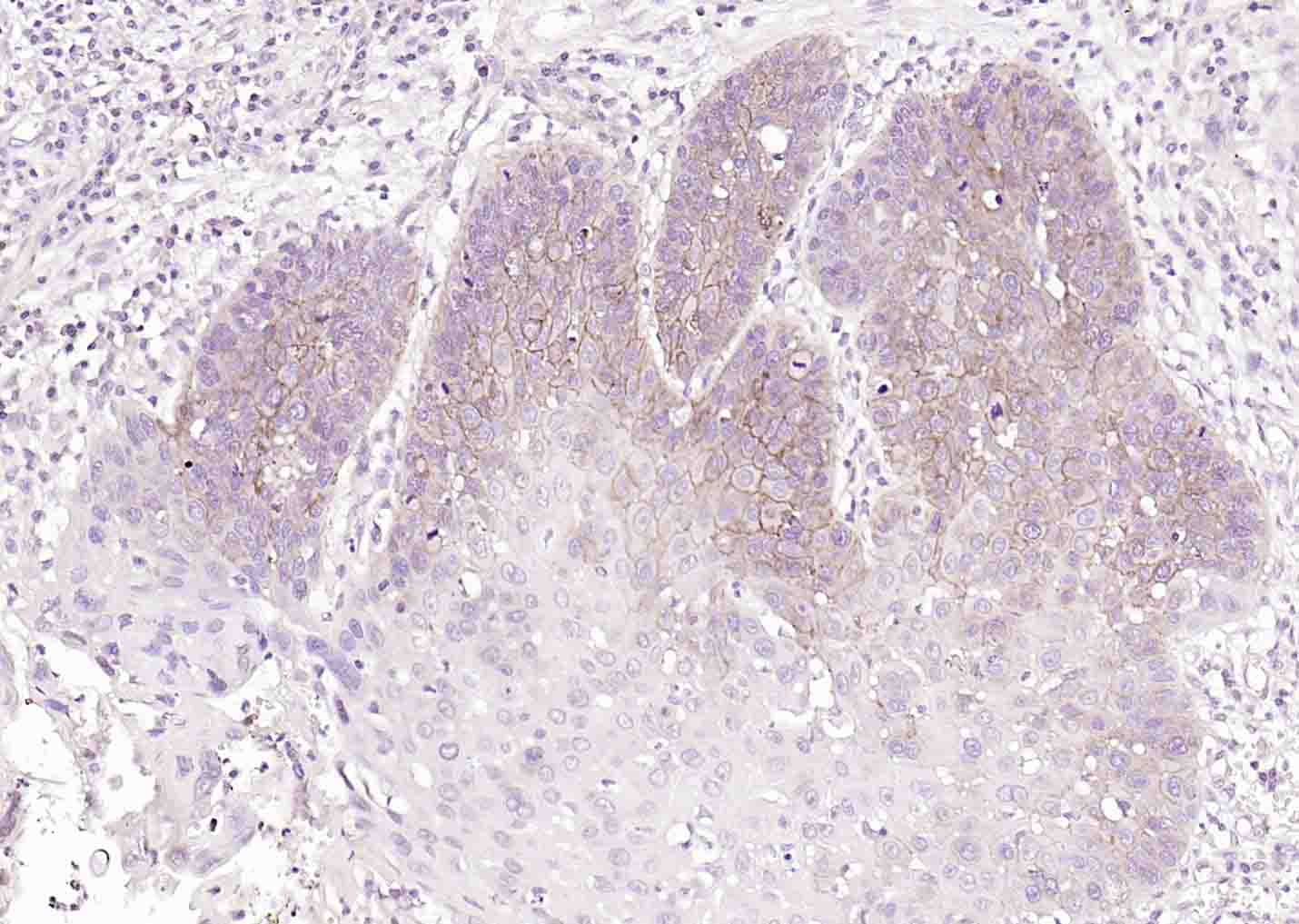 Paraformaldehyde-fixed, paraffin embedded Human Laryngeal Cancer; Antigen retrieval by boiling in sodium citrate buffer (pH6.0) for 15 min; Antibody incubation with ATP1A1 Polyclonal Antibody, Unconjugated (bs-9570R) at 1:200 overnight at 4°C, followed by conjugation to the bs-0295G-HRP and DAB (C-0010) staining.