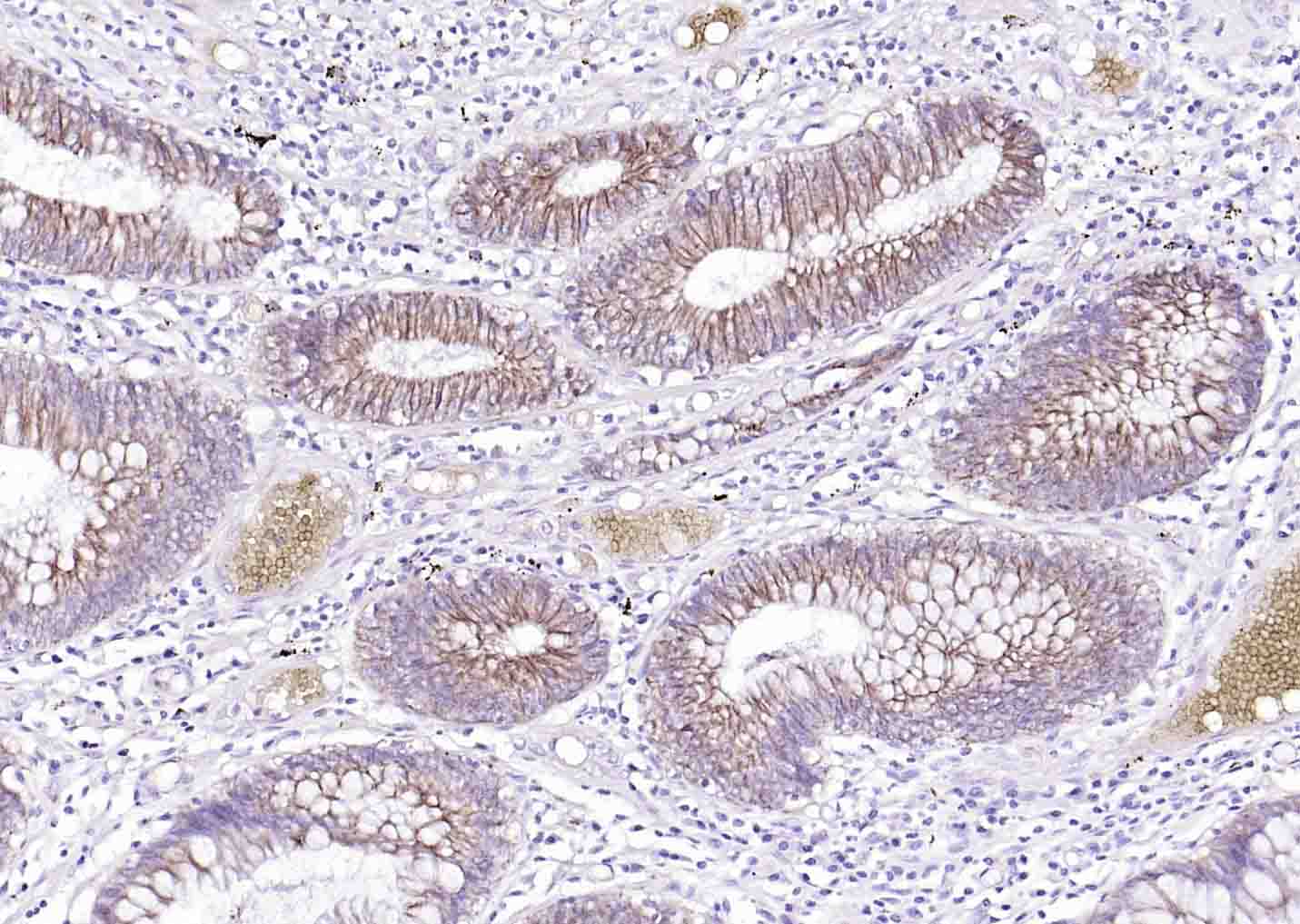 Paraformaldehyde-fixed, paraffin embedded Human Colon; Antigen retrieval by boiling in sodium citrate buffer (pH6.0) for 15 min; Antibody incubation with ATP1A1? Polyclonal Antibody, Unconjugated (bs-9570R) at 1:200 overnight at 4°C, followed by conjugation to the bs-0295G-HRP and DAB (C-0010) staining.