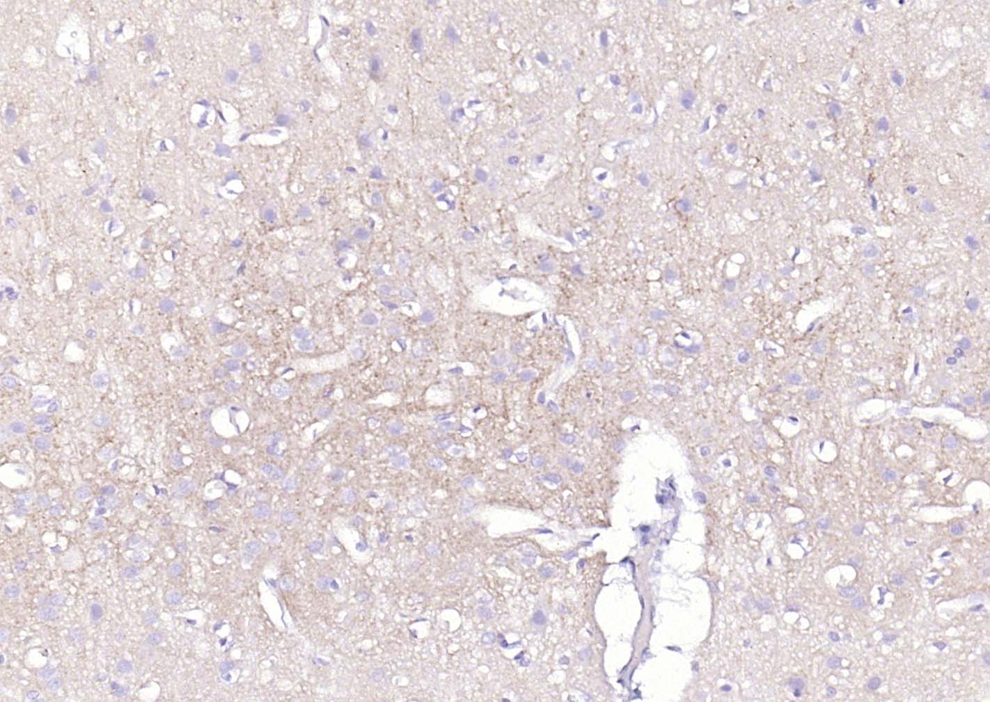 Paraformaldehyde-fixed, paraffin embedded Human Cerebrum; Antigen retrieval by boiling in sodium citrate buffer (pH6.0) for 15 min; Antibody incubation with ATP1A1? Polyclonal Antibody, Unconjugated (bs-9570R) at 1:200 overnight at 4°C, followed by conjugation to the bs-0295G-HRP and DAB (C-0010) staining.