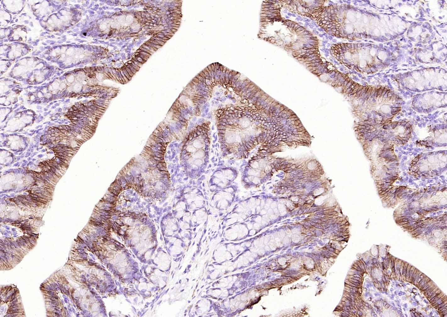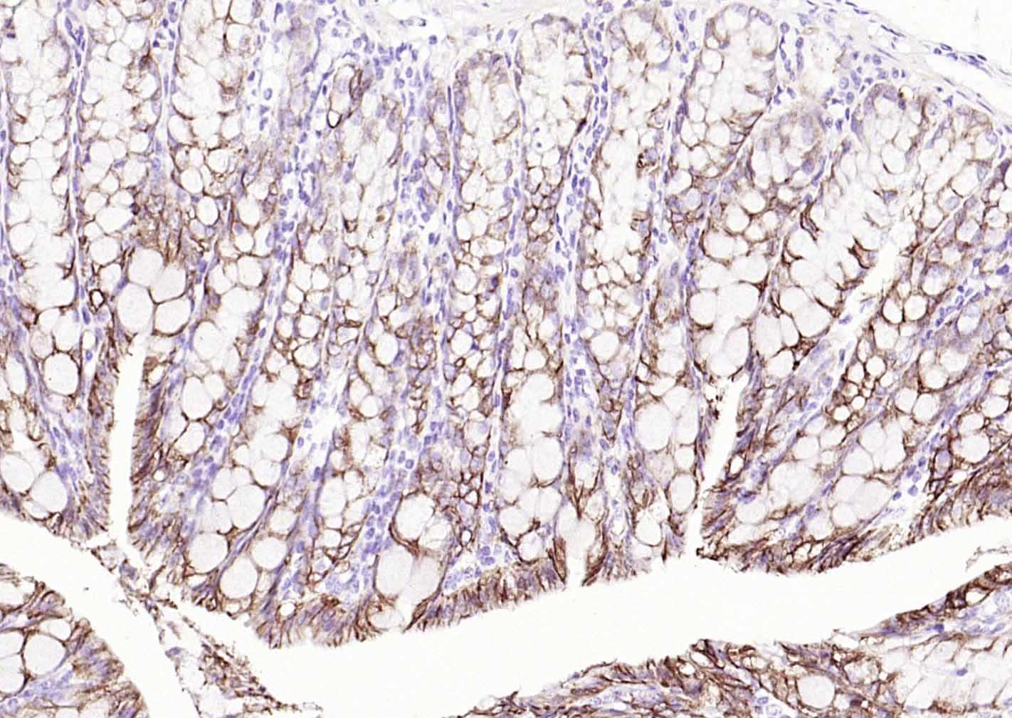Paraformaldehyde-fixed, paraffin embedded Mouse Colon; Antigen retrieval by boiling in sodium citrate buffer (pH6.0) for 15 min; Antibody incubation with ATP1A1? Polyclonal Antibody, Unconjugated (bs-9570R) at 1:200 overnight at 4°C, followed by conjugation to the bs-0295G-HRP and DAB (C-0010) staining.