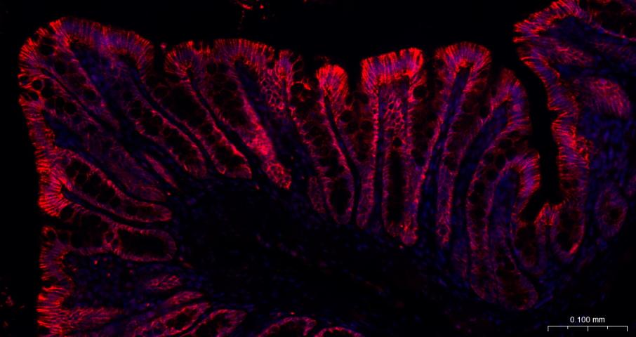 Paraformaldehyde-fixed, paraffin embedded (mouse Colon); Antigen retrieval by boiling in sodium citrate buffer (pH6.0) for 15min; Blocking buffer (normal goat serum) at 37°C for 30min; Incubation with (ATP1A1) Polyclonal Antibody, Unconjugated (bs-9570R) at 1:200 overnight at 4°C, followed by a conjugated Goat Anti-Rabbit IgG antibody (bs-0295G-AF594) for 90 minutes, and DAPI for nuclei staining.