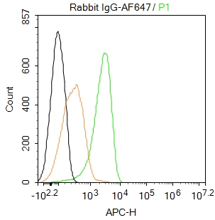 Blank control: Molt4. Isotype Control:Rabbit IgG-AF647(bs-0295P-BF647) Dilution: 1ug/Test; Primary Antibody (green line): Rabbit Anti- C20orf118 antibody (bs-15092R-AF647) Dilution: 1ug/Test; Protocol The cells were fixed with 4% PFA (10min at room temperature)and then permeabilized with 0.1% PBST for 20 min at room temperature.The cells were incubated in 5%BSA to block non-specific protein-protein interactions for 30 min at room temperature .Cells stained with Primary Antibody for 30 min at room temperature.Isotype control antibody (orange line) was rabbit IgG. Acquisition of 20,000 events was performed.