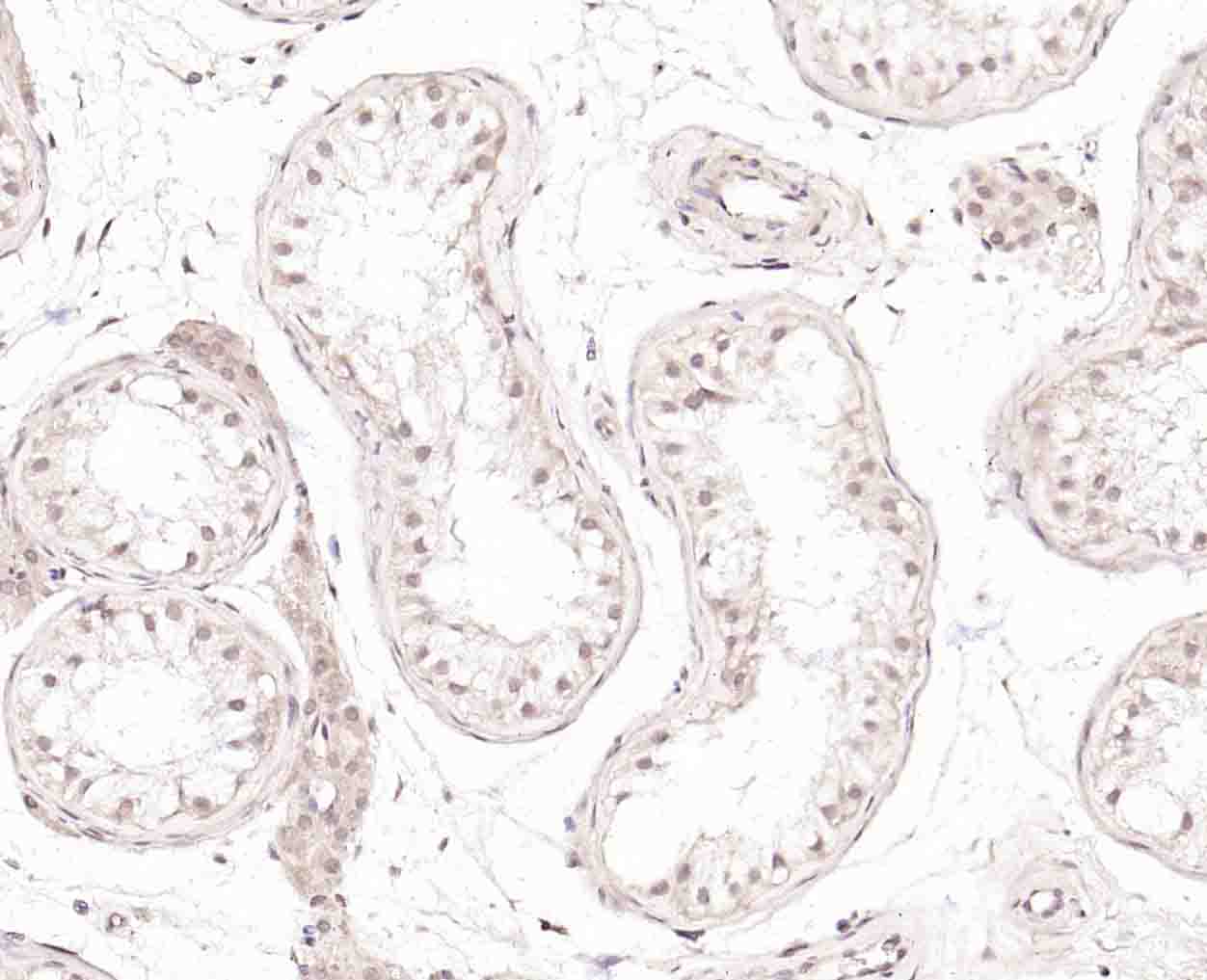 Paraformaldehyde-fixed, paraffin embedded (human testis); Antigen retrieval by boiling in sodium citrate buffer (pH6.0) for 15min; Block endogenous peroxidase by 3% hydrogen peroxide for 20 minutes; Blocking buffer (normal goat serum) at 37°C for 30min; Incubation with (BRMS1 Rabbit pAb) Polyclonal Antibody, Unconjugated (bs-8686R) at 1:200 overnight at 4°C, followed by operating according to SP Kit(Rabbit) (sp-0023) instructionsand DAB staining