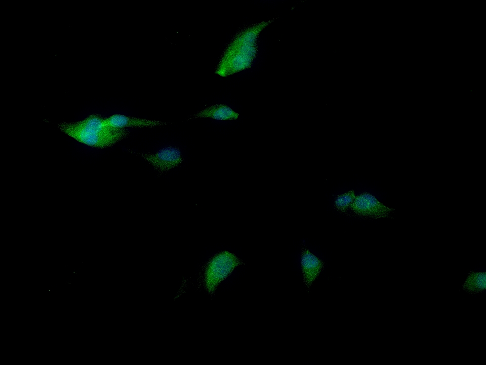 U87MG cell; 4% Paraformaldehyde-fixed; Triton X-100 at room temperature for 20 min; Blocking buffer (normal goat serum, C-0005) at 37°C for 20 min; Antibody incubation with (OLIG2) polyclonal Antibody, Unconjugated (bs-11194R) 1:100, 90 minutes at 37°C; followed by a conjugated Goat Anti-Rabbit IgG antibody at 37°C for 90 minutes, DAPI (blue, C02-04002) was used to stain the cell nuclei.