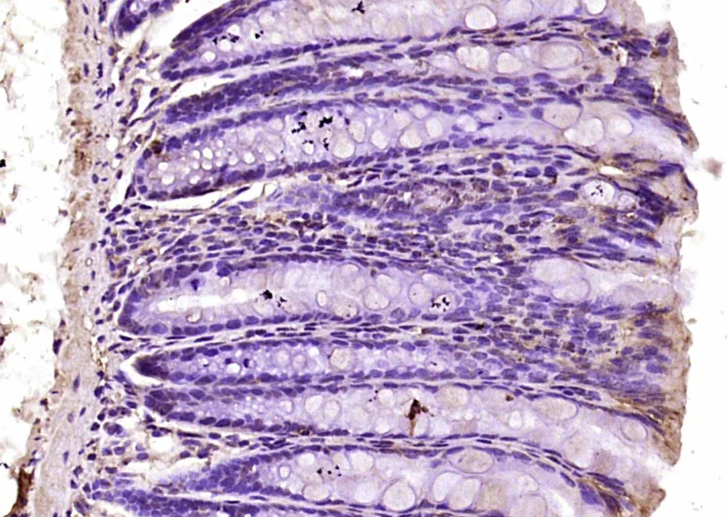 Paraformaldehyde-fixed, paraffin embedded (mouse colon); Antigen retrieval by boiling in sodium citrate buffer (pH6.0) for 15min; Block endogenous peroxidase by 3% hydrogen peroxide for 20 minutes; Blocking buffer (normal goat serum) at 37°C for 30min; Antibody incubation with (PLAGL1) Polyclonal Antibody, Unconjugated (bs-11206R) at 1:200 overnight at 4°C, followed by operating according to SP Kit(Rabbit) (sp-0023) instructionsand DAB staining.