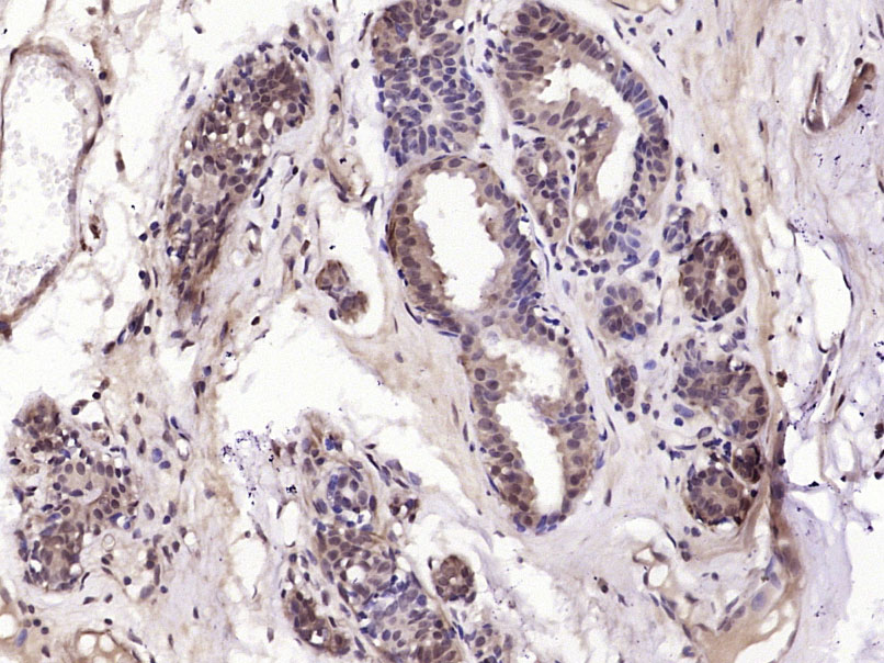 Paraformaldehyde-fixed, paraffin embedded (Human breast); Antigen retrieval by boiling in sodium citrate buffer (pH6.0) for 15min; Block endogenous peroxidase by 3% hydrogen peroxide for 20 minutes; Blocking buffer (normal goat serum) at 37°C for 30min; Antibody incubation with (ESE1) Polyclonal Antibody, Unconjugated (bs-11279R) at 1:400 overnight at 4°C, followed by operating according to SP Kit(Rabbit) (sp-0023) instructionsand DAB staining.