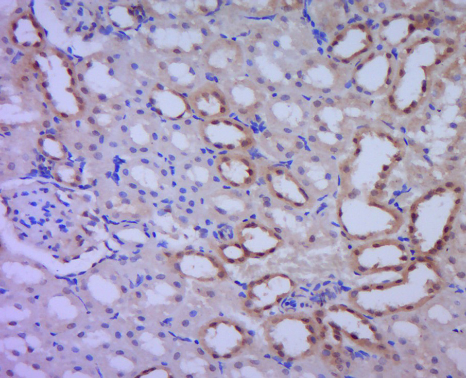 Paraformaldehyde-fixed, paraffin embedded (rat kidney tissue); Antigen retrieval by boiling in sodium citrate buffer (pH6.0) for 15min; Block endogenous peroxidase by 3% hydrogen peroxide for 20 minutes; Blocking buffer (normal goat serum) at 37°C for 30min; Antibody incubation with (Alpha-synuclein (nitro-Tyr39)) Polyclonal Antibody, Unconjugated (bs-9587R) at 1:400 overnight at 4°C, followed by a conjugated secondary (sp-0023) for 20 minutes and DAB staining.