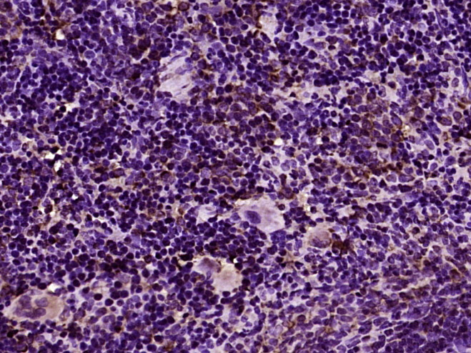 Paraformaldehyde-fixed, paraffin embedded (rat spleen tissue); Antigen retrieval by boiling in sodium citrate buffer (pH6.0) for 15min; Block endogenous peroxidase by 3% hydrogen peroxide for 20 minutes; Blocking buffer (normal goat serum) at 37°C for 30min; Antibody incubation with (TLR8) Polyclonal Antibody, Unconjugated (bs-8684R) at 1:400 overnight at 4°C, followed by operating according to SP Kit(Rabbit) (sp-0023) instructionsand DAB staining.