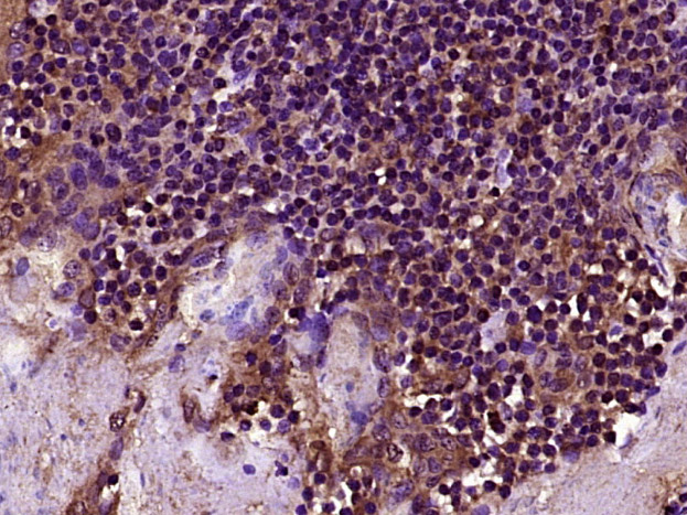Paraformaldehyde-fixed, paraffin embedded (human tonsil tissue); Antigen retrieval by boiling in sodium citrate buffer (pH6.0) for 15min; Block endogenous peroxidase by 3% hydrogen peroxide for 20 minutes; Blocking buffer (normal goat serum) at 37°C for 30min; Antibody incubation with (TLR8) Polyclonal Antibody, Unconjugated (bs-8684R) at 1:400 overnight at 4°C, followed by operating according to SP Kit(Rabbit) (sp-0023) instructionsand DAB staining.