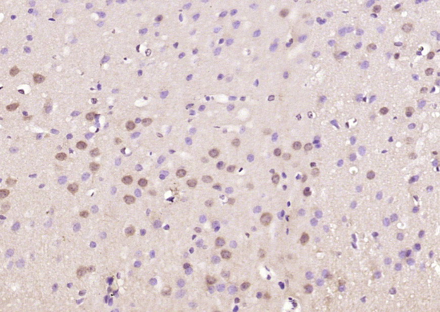 Paraformaldehyde-fixed, paraffin embedded (mouse brain); Antigen retrieval by boiling in sodium citrate buffer (pH6.0) for 15min; Block endogenous peroxidase by 3% hydrogen peroxide for 20 minutes; Blocking buffer (normal goat serum) at 37°C for 30min; Antibody incubation with (ELAVL4) Polyclonal Antibody, Unconjugated (bs-11319R) at 1:200 overnight at 4°C, followed by operating according to SP Kit(Rabbit) (sp-0023) instructionsand DAB staining.