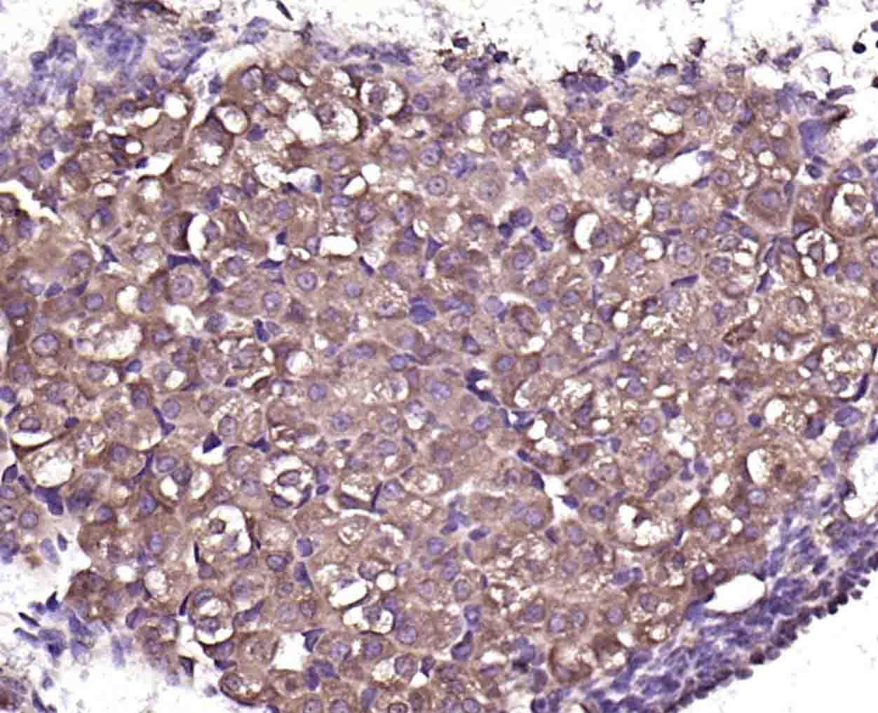 Paraformaldehyde-fixed, paraffin embedded (human adrenal gland); Antigen retrieval by boiling in sodium citrate buffer (pH6.0) for 15min; Block endogenous peroxidase by 3% hydrogen peroxide for 20 minutes; Blocking buffer (normal goat serum) at 37°C for 30min; Incubation with (phospho-DAB2 (Ser24)) Polyclonal Antibody, Unconjugated (bs-11044R) at 1:200 overnight at 4°C, followed by operating according to SP Kit(Rabbit) (sp-0023) instructionsand DAB staining.