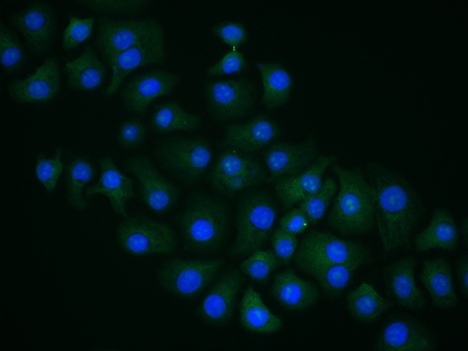 HepG2 cell; 4% Paraformaldehyde-fixed; Triton X-100 at room temperature for 20 min; Blocking buffer (normal goat serum, C-0005) at 37°C for 20 min; Antibody incubation with (Arginase II) polyclonal Antibody, Unconjugated (bs-11397R) 1:100, 90 minutes at 37°C; followed by a conjugated Goat Anti-Rabbit IgG antibody at 37°C for 90 minutes, DAPI (blue, C02-04002) was used to stain the cell nuclei.