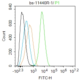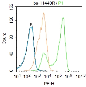Blank control: HepG2. Primary Antibody (green line): Rabbit Anti-THRB1 antibody (bs-11440R) Dilution: 1μg /10^6 cells; Isotype Control Antibody (orange line): Rabbit IgG . Secondary Antibody : Goat anti-rabbit IgG-PE Dilution: 1μg /test. Protocol The cells were fixed with 4% PFA (10min at room temperature)and then permeabilized with 90% ice-cold methanol for 20 min at-20℃. The cells were then incubated in 5%BSA to block non-specific protein-protein interactions for 30 min at at room temperature .Cells stained with Primary Antibody for 30 min at room temperature. The secondary antibody used for 40 min at room temperature. Acquisition of 20,000 events was performed.