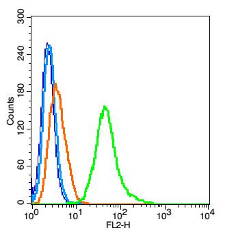 Blank control(blue): RSC96 cells(fixed with 2% paraformaldehyde (10 min) , then permeabilized with 90% ice-cold methanol for 30 min on ice). Primary Antibody:Rabbit Anti- PDE7A antibody(bs-11575R), Dilution: 1μg in 100 μL 1X PBS containing 0.5% BSA; Isotype Control Antibody: Rabbit IgG(orange) ,used under the same conditions ); Secondary Antibody: Goat anti-rabbit IgG-PE(white blue), Dilution: 1:200 in 1 X PBS containing 0.5% BSA.
