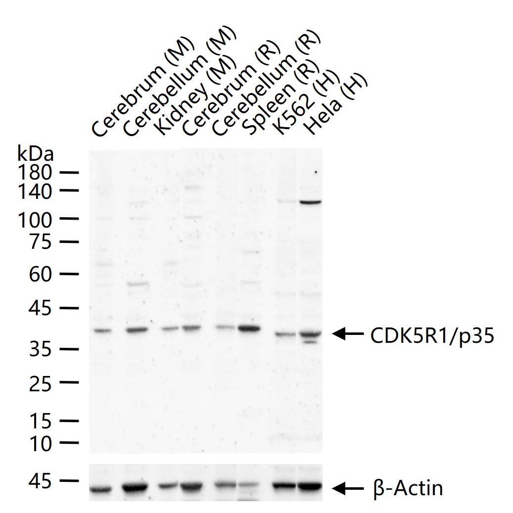 25 ug total protein per lane of various lysates (see on figure) probed with CDK5R1/p35 polyclonal antibody, unconjugated (bs-11611R) at 1:1000 dilution and 4°C overnight incubation. Followed by conjugated secondary antibody incubation at r.t. for 60 min.