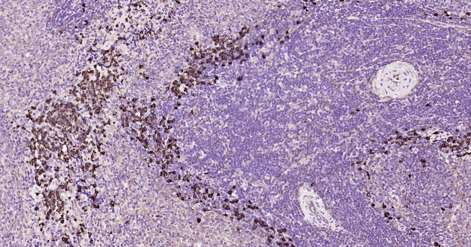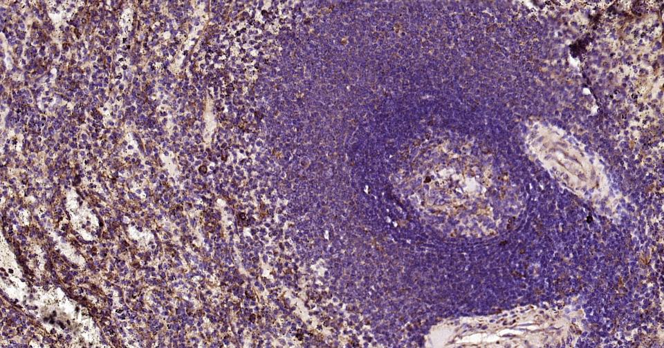 Paraformaldehyde-fixed, paraffin embedded Rat Spleen; Antigen retrieval by boiling in sodium citrate buffer (pH6.0) for 15 min; Antibody incubation with NALP3/CIAS1 Polyclonal Antibody, Unconjugated (bs-10021R) at 1:200 overnight at 4°C, followed by conjugation to the bs-0295G-HRP and DAB (C-0010) staining.