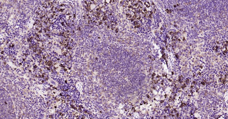 Paraformaldehyde-fixed, paraffin embedded Mouse Spleen; Antigen retrieval by boiling in sodium citrate buffer (pH6.0) for 15 min; Antibody incubation with NALP3/CIAS1 Polyclonal Antibody, Unconjugated (bs-10021R) at 1:200 overnight at 4°C, followed by conjugation to the bs-0295G-HRP and DAB (C-0010) staining.