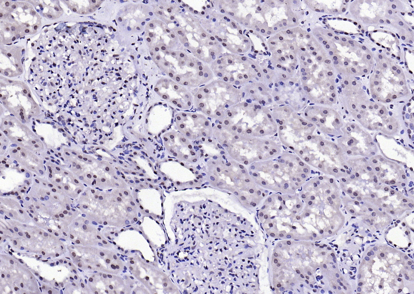 Paraformaldehyde-fixed, paraffin embedded (human kidney); Antigen retrieval by boiling in sodium citrate buffer (pH6.0) for 15min; Block endogenous peroxidase by 3% hydrogen peroxide for 20 minutes; Blocking buffer (normal goat serum) at 37°C for 30min; Antibody incubation with (BPTF) Polyclonal Antibody, Unconjugated (bs-11641R) at 1:200 overnight at 4°C, followed by operating according to SP Kit(Rabbit) (sp-0023) instructionsand DAB staining.