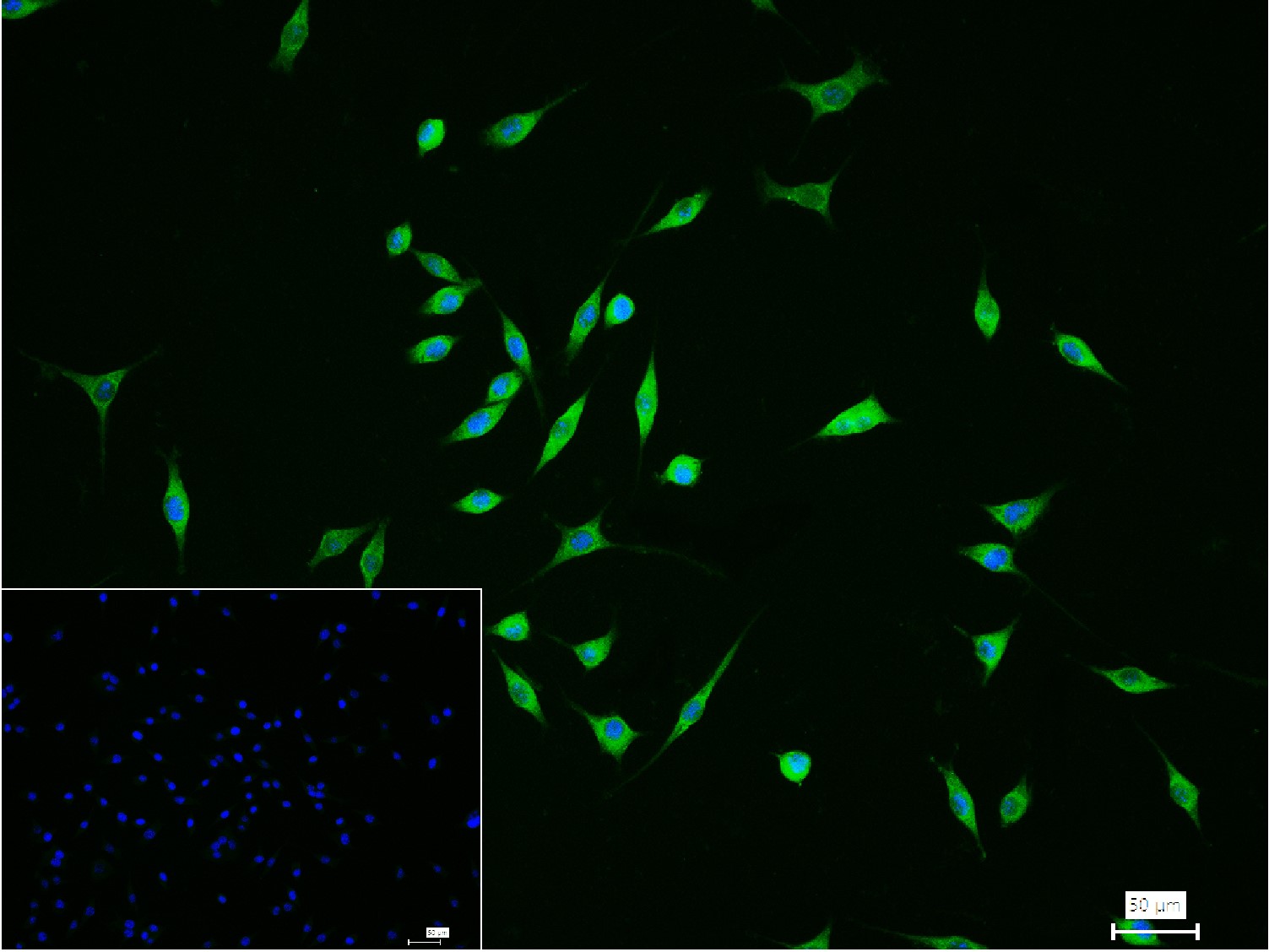 4% Paraformaldehyde-fixed SH-SY5Y (H) cell; Triton X-100 at r.t. for 20 min; Antibody incubation with (PGP9.5) polyclonal Antibody, unconjugated (bs-11677R) 1:100, 90 min at 37°C; followed by conjugated Goat Anti-Rabbit IgG antibody (green, bs-40295G-FITC) at 37°C for 90 min, DAPI (blue, C02-04002) was used to stain the cell nuclei. PBS instead of the primary antibody was used as the blank control.