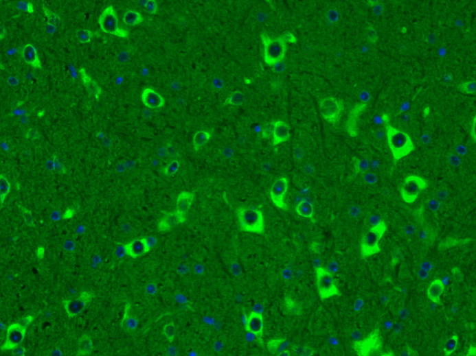 Paraformaldehyde-fixed, paraffin embedded (Mouse brain); Antigen retrieval by boiling in sodium citrate buffer (pH6.0) for 15min; Block endogenous peroxidase by 3% hydrogen peroxide for 20 minutes; Blocking buffer (normal goat serum) at 37°C for 30min; Antibody incubation with (Somatostatin 14) Polyclonal Antibody, Unconjugated (bs-11796R) at 1:400 overnight at 4°C, followed by a conjugated Goat Anti-Rabbit IgG antibody (bs-0295G-FITC) for 90 minutes, and DAPI for nuclei staining.