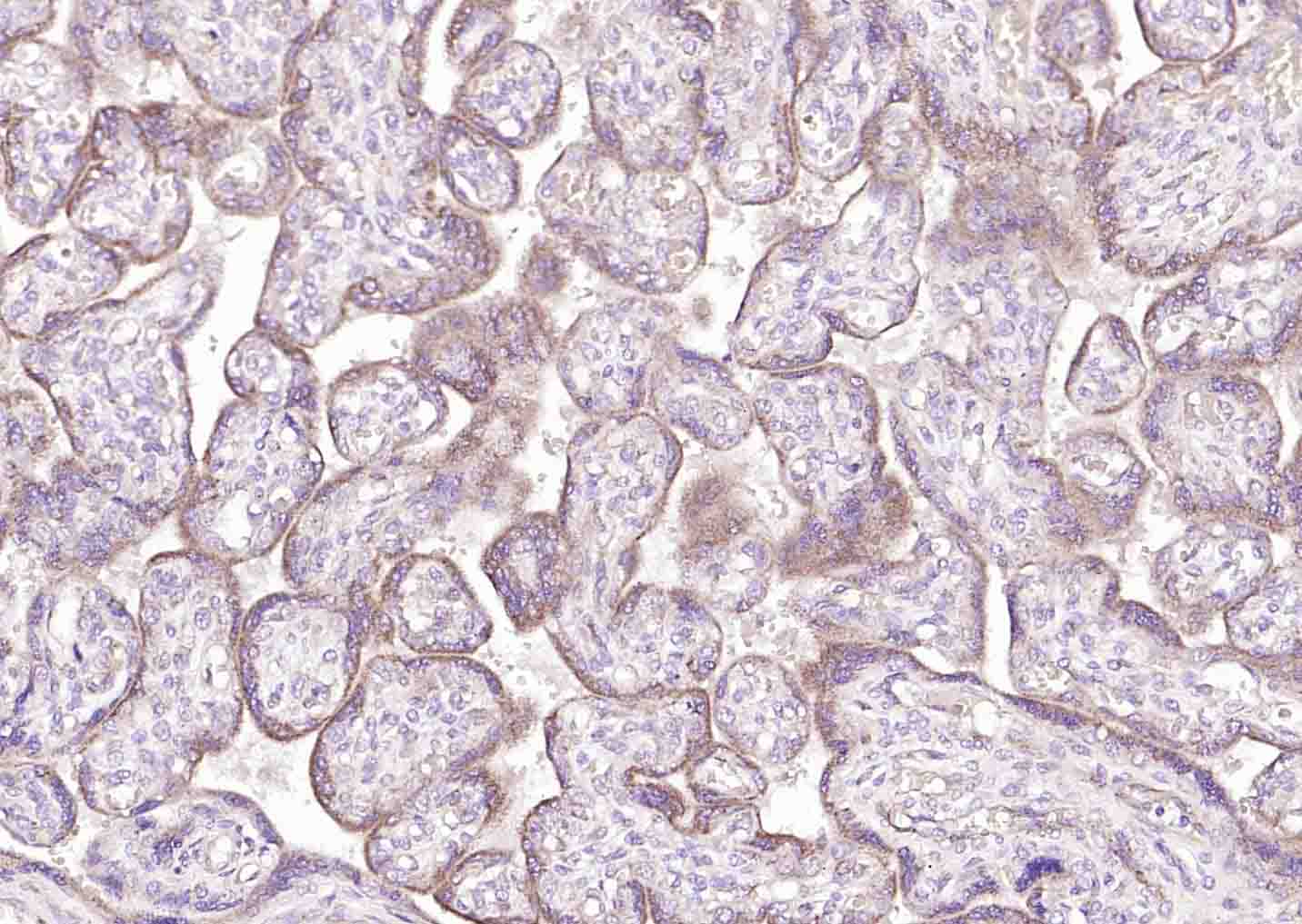 Paraformaldehyde-fixed, paraffin embedded (human placenta); Antigen retrieval by boiling in sodium citrate buffer (pH6.0) for 15min; Block endogenous peroxidase by 3% hydrogen peroxide for 20 minutes; Blocking buffer (normal goat serum) at 37°C for 30min; Incubation with (ACKR3) Polyclonal Antibody, Unconjugated (bs-4897R) at 1:200 overnight at 4°C, followed by operating according to SP Kit(Rabbit) (sp-0023) instructionsand DAB staining.