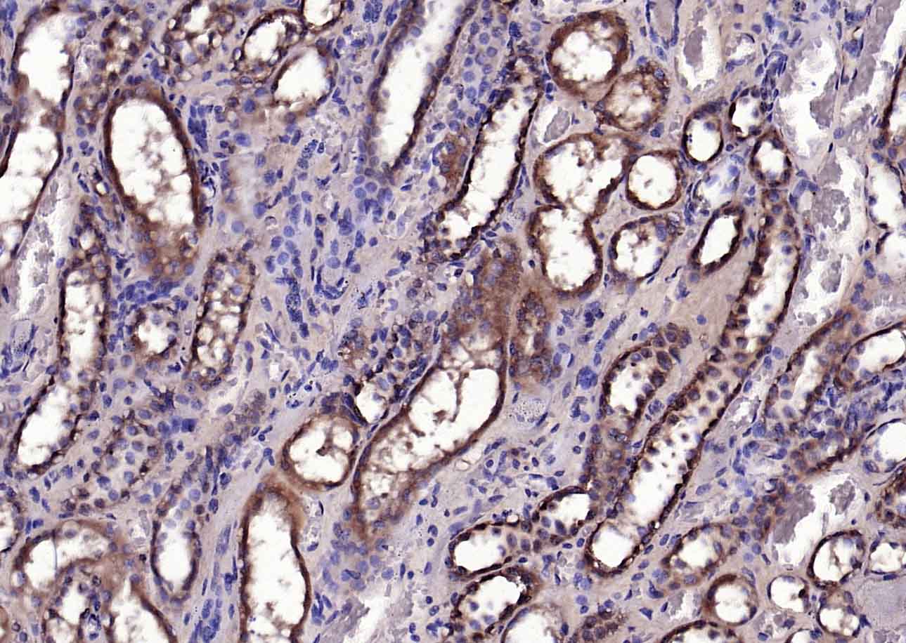 Paraformaldehyde-fixed, paraffin embedded (Human kidney); Antigen retrieval by boiling in sodium citrate buffer (pH6.0) for 15min; Block endogenous peroxidase by 3% hydrogen peroxide for 20 minutes; Blocking buffer (normal goat serum) at 37°C for 30min; Antibody incubation with (CACNA1G + CACNA1H) Polyclonal Antibody, Unconjugated (bs-11984R) at 1:200 overnight at 4°C, followed by operating according to SP Kit(Rabbit) (sp-0023) instructionsand DAB staining.