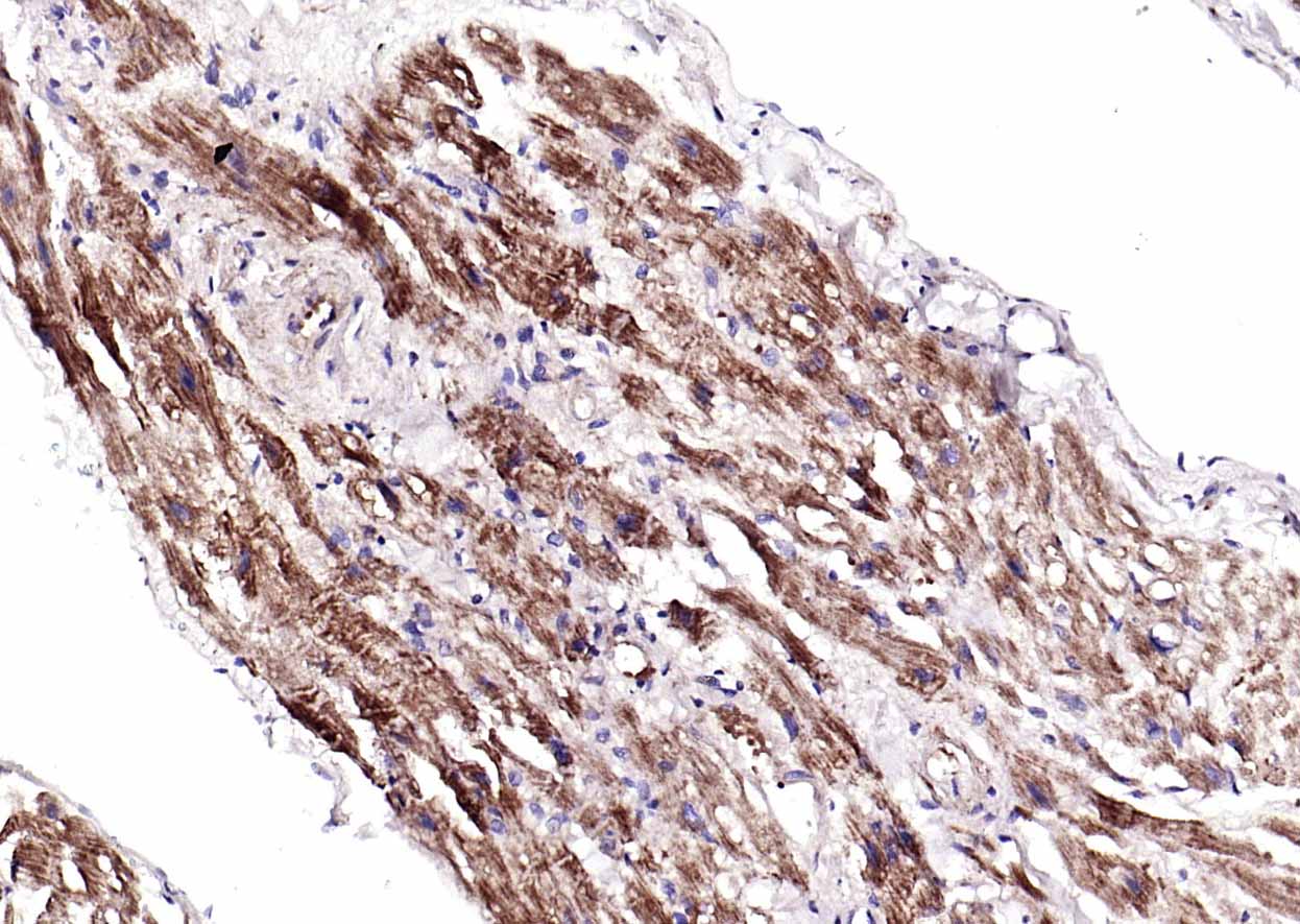 Paraformaldehyde-fixed, paraffin embedded (human myocardium); Antigen retrieval by boiling in sodium citrate buffer (pH6.0) for 15min; Block endogenous peroxidase by 3% hydrogen peroxide for 20 minutes; Blocking buffer (normal goat serum) at 37°C for 30min; Antibody incubation with (CACNA1G + CACNA1H) Polyclonal Antibody, Unconjugated (bs-11984R) at 1:200 overnight at 4°C, followed by operating according to SP Kit(Rabbit) (sp-0023) instructionsand DAB staining.
