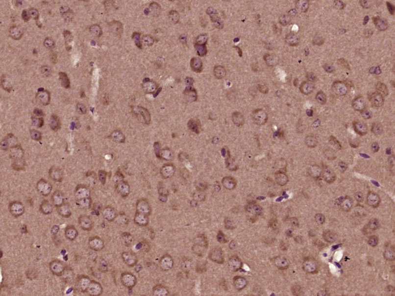 Paraformaldehyde-fixed, paraffin embedded (Mouse brain); Antigen retrieval by boiling in sodium citrate buffer (pH6.0) for 15min; Block endogenous peroxidase by 3% hydrogen peroxide for 20 minutes; Blocking buffer (normal goat serum) at 37°C for 30min; Antibody incubation with (CHRNA9) Polyclonal Antibody, Unconjugated (bs-12113R) at 1:400 overnight at 4°C, followed by operating according to SP Kit(Rabbit) (sp-0023) instructionsand DAB staining.